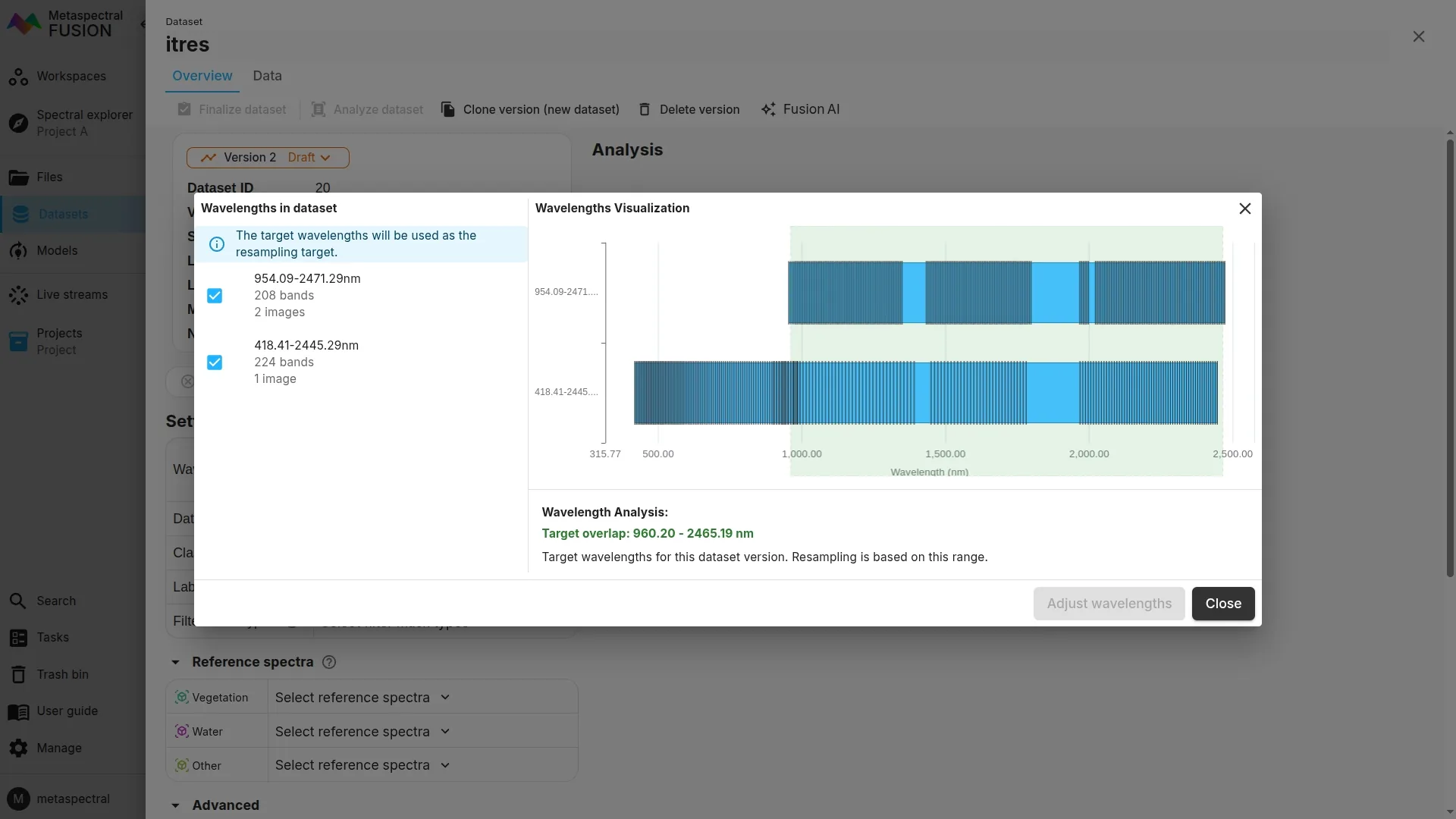 The dialog will show all center wavelengths in your dataset (for images and reference spectra). If an overlap exists, you will see it with a green highlight. If an overlap doesn't exist, you must deselect one or more center wavelengths and click Adjust wavelengths — this will remove data with these center wavelengths so a dataset can be created.