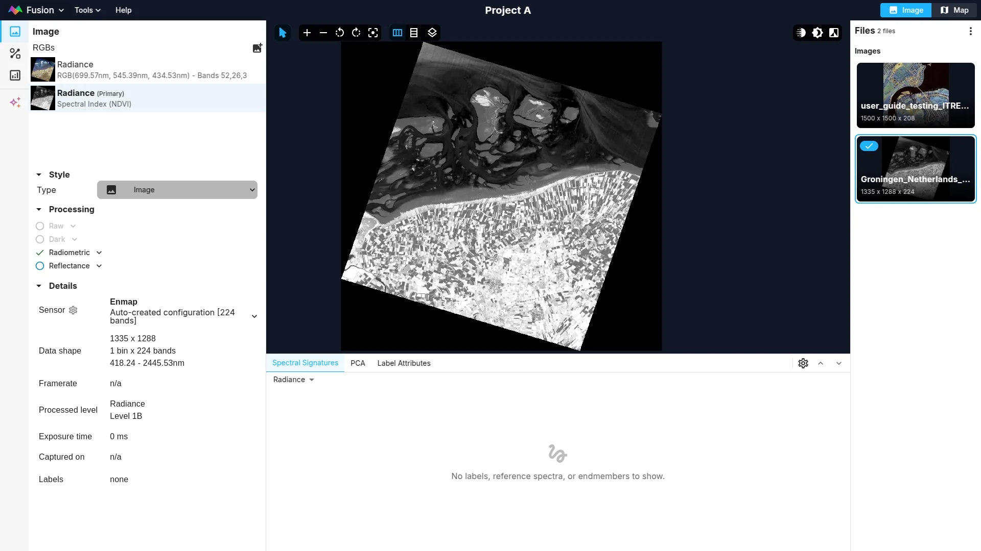 The image tab allows you to view your image metadata, change or generate new RGBs, edit the style (color map, opacity, etc.), and change preprocessing steps.